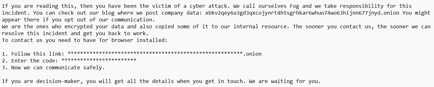 This is an average FOG ransomware note. (With slight redaction in the interest of public safety)